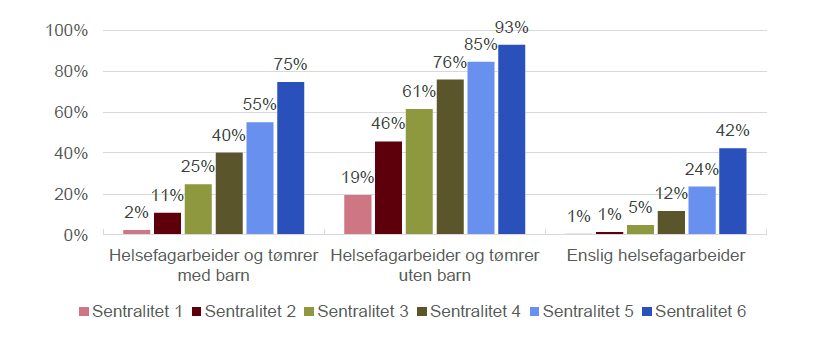 Kjøpekraften er desidert dårligst i de store byene, og er størst i de minst sentrale delene av landet. Figur 2 viser kjøpekraften til en familie med to barn. For en enslig helsefagarbeider er kjøpekraften lavere i alle sentralitetsklasser.