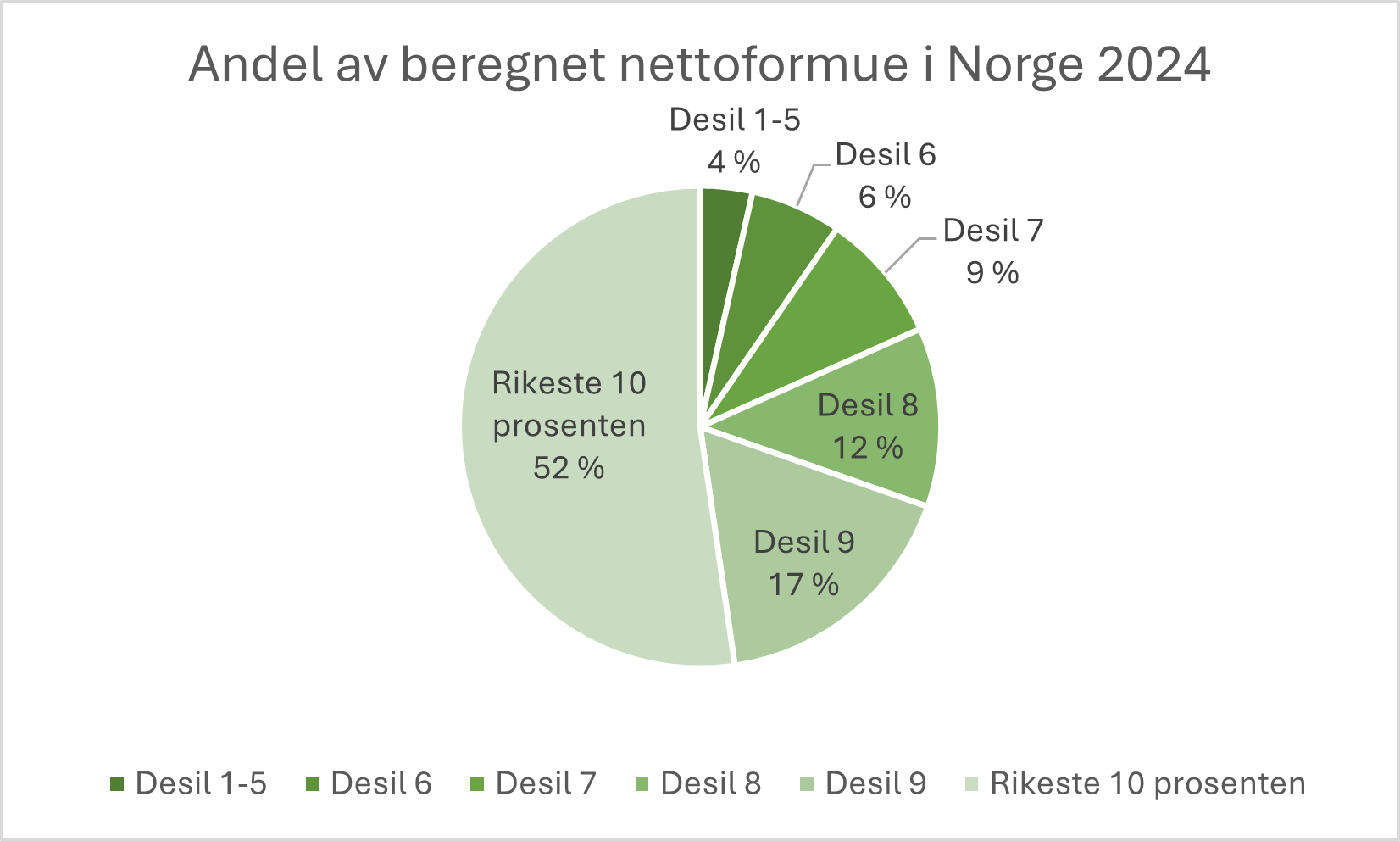 Deler vi befolkningen i ti grupper med like mange i hver (desiler), viser SSBs tall at de ti prosent rikeste i Norge besitter 52,2 prosent av all formue i Norge. Konsentrer vi bildet ytterligere ser vi at den rikeste prosenten eier 20 prosent og den rikeste tusendelen eier hele ti prosent av all formue.