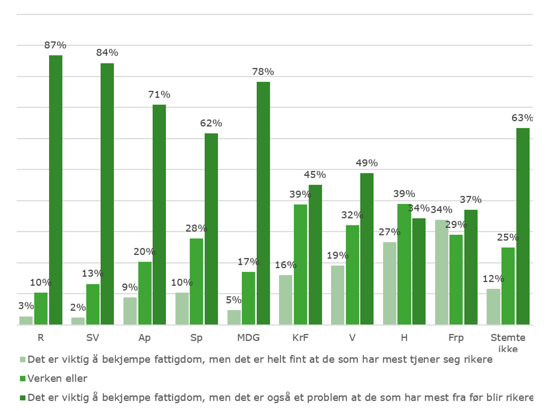 Bare 15 prosent er enig utsagnet: «Det er viktig å bekjempe fattigdom, men det er helt fint at de som har mest tjener seg rikere». I grafen under ser du resultatene fordelt etter partivalg i Stortingsvalget 2021.