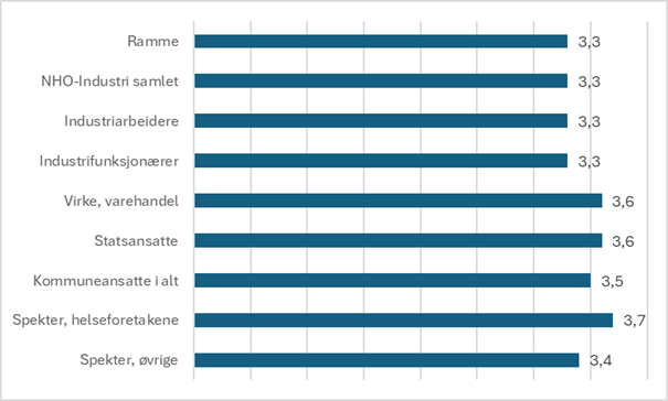 Det største avviket mellom rammeanslaget og lønnsveksten finner vi i industrien. Mye av avviket kan imidlertid forklares ved at det har kommet inn flere høytlønte, ikke at den enkelte arbeidstaker i industrien har fått veldig mye høyere lønnsvekst enn andre grupper. Mange har likevel fått en del tillegg som følge av doble skift i næringer med svært høy aktivitet, som verksteder og i våpenproduksjon. Den økte aktiviteten i kan blant annet knyttes til aktivitetspakken for petroleumsindustrien, og til at høye gasspriser førte til stans i vedlikeholdet på plattformene i Nordsjøen i 2024. Dermed måtte mye arbeid tas igjen i 2025.