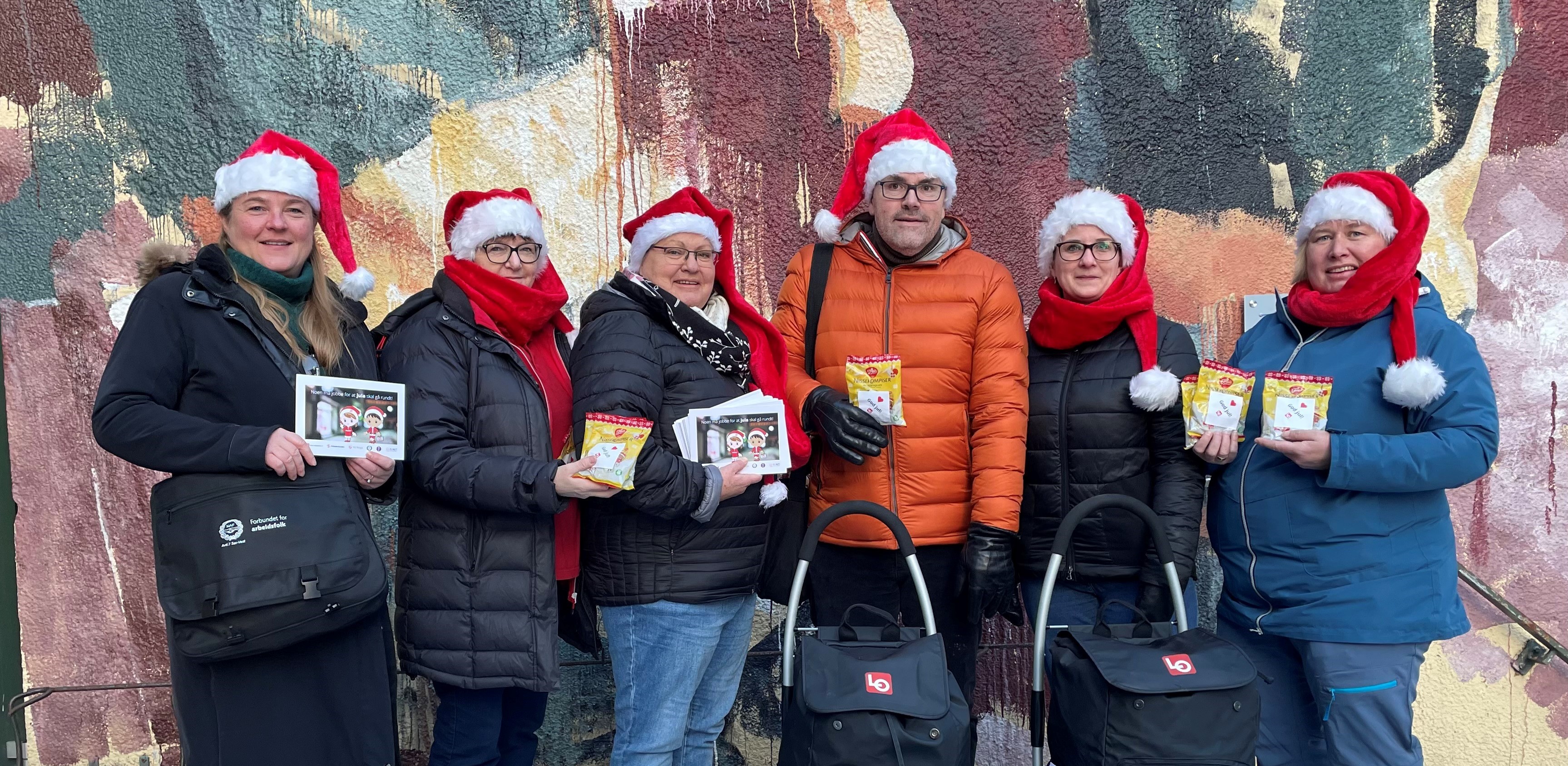 Som alltid ville Serviceprosjektet ut å gå, -også i dag. I dag var de fullastet med julesnop og informasjon til både medlemmer og andre. Seks aktive deltakere fra Handel og Kontor, Fellesforbundet, Arbeidsmandsforbundet, Fagforbundet og LO smilte og bukket idet de skulle ut på en runde for å fortelle om rettigheter og plikter i forbindelse med jul og nyttår. Samtidig har de med et lass med julesnop. Det er for å vise takknemlighet overfor dem som arbeider i servicesektoren i en av de travleste periodene i året. Både butikkekspeditører, renholdere, vektere, resepsjonister, kontoransatte og mange, mange andre grupper, står på fra tidlig formiddag og til langt på kvelden. Til og med helgene blir brukt til å hjelpe andre på et eller annet vis for at vi skal få en fin jul. Tusen takk til dere alle sammen!