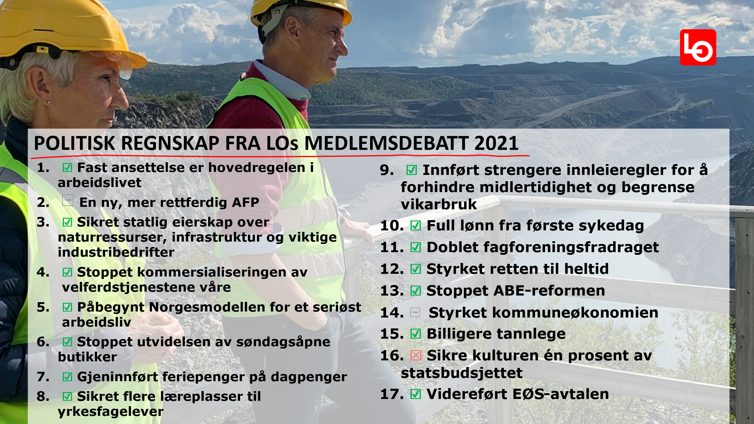 Med bakgrunn i svarene stilte LO 54 spørsmål til partiene. Svarene ble oppsummert i heftet Partiene svarer LO 2021.