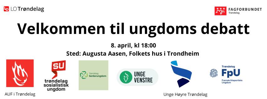 Ungdomsutvalget i Fagforbundet Trøndelag, i samarbeid med LO Trøndelag, inviterer alle interesserte til en ungdomsdebatt den 8. april kl. 18:00. Arrangementet finner sted på Folkets Hus i Trondheim, møterom Augusta Aasen, inngang A eller B.