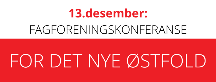 Fagforeningskonferansen arrangeres 13. desember kl. 08.30 - 15.00 på Scandic City hotel i Fredrikstad. Vi vil sette fokuset på å bygge Nye Østfold, samt egen organisasjonsutvikling og hvordan vi sammen kan påvirke å skape det beste arbeids- og samfunnsliv for medlemmene bl.a. opp mot neste års kommune- og fylkestingsvalg.