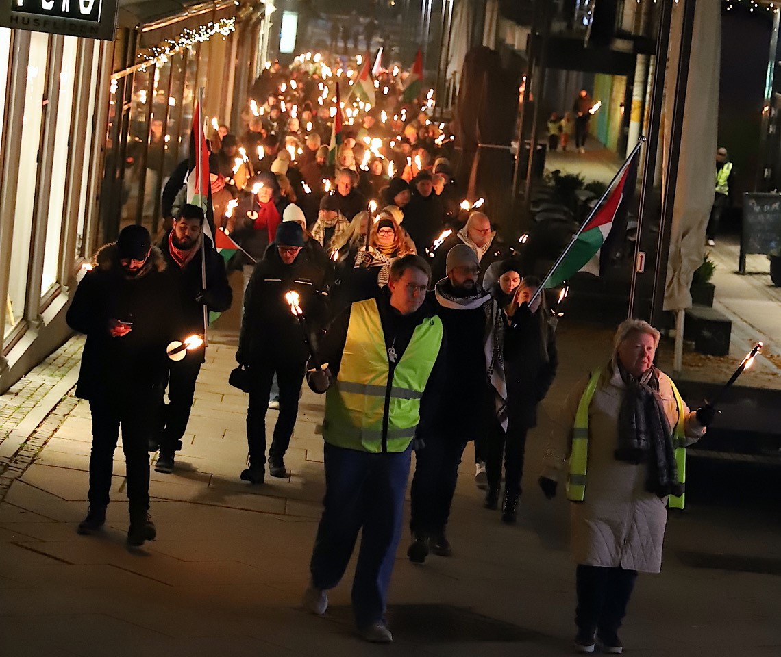 Oppslutningen var god, og ropene var enstemmig da LO Moss og Norsk Folkehjelp arrangerte fakkeltog for å vise solidaritet med palestinernes enorme lidelser på Gazastripen; Stopp galskapen. Vi krever våpenhvile nå!