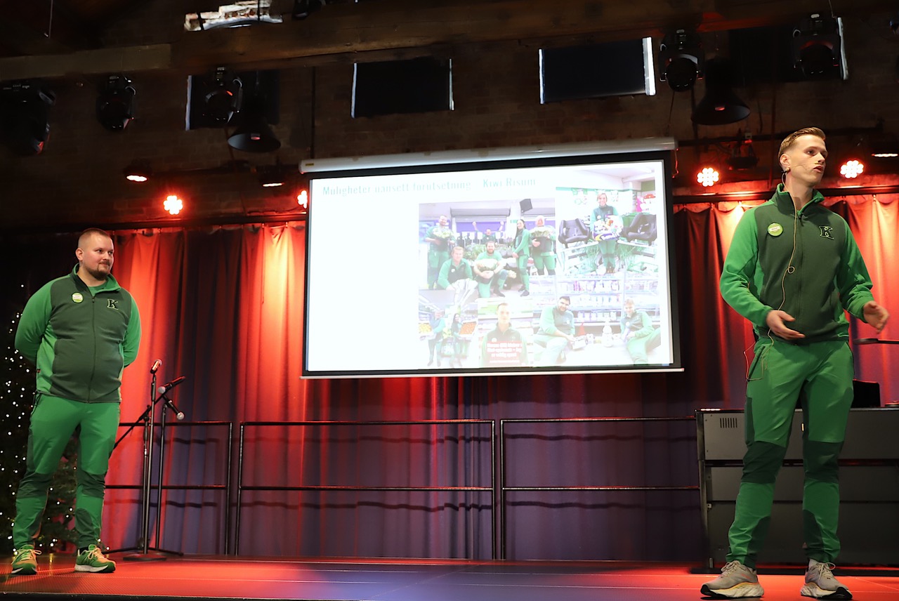 Henrik Norum-Johansen (t.v.) og Marcus Torp var begge skoleleie, men fant seg fort til rette da de fikk en mulighet i KIWI. I dag er de henholdsvis butikksjef for KIWI Risum og assisterende butikksjef på Kiwi Grålum. De fortalte hvordan butikk-kjeden jobbet bevisst for å inkludere arbeidstakere som fort kunne ha havnet utenfor arbeidslivet, og trakk fram flere konkrete eksempler på hvordan de har lykkes.