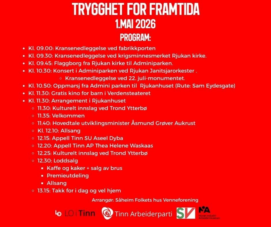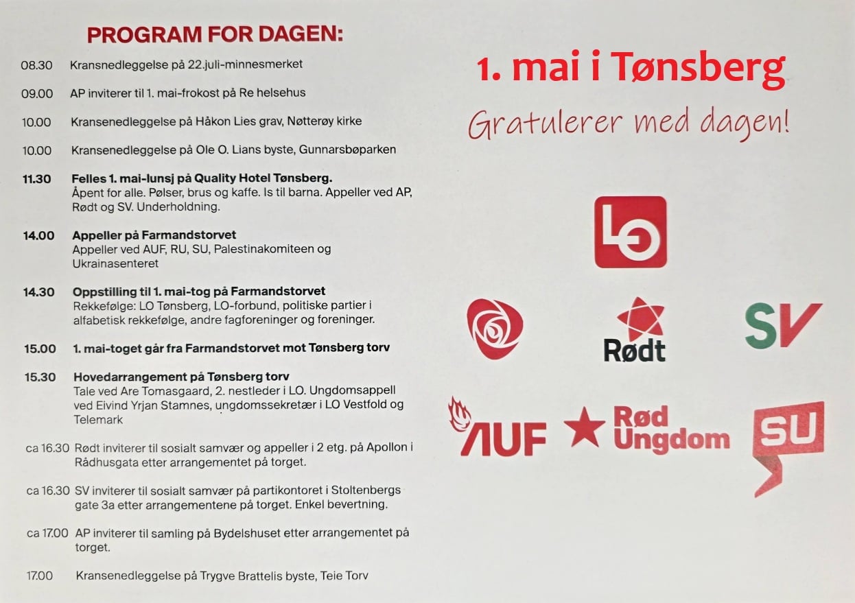 12.00 - 14.00 - Taler, appeller, musikk og stands med LO, Fellesforbundet, Fagforbundet, AP, SV, Rødt og Norsk Folkehjelp.