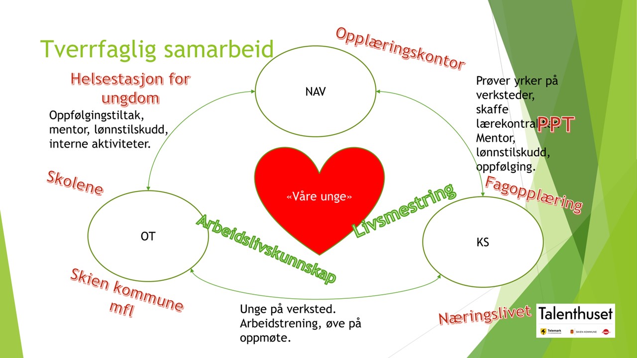 Talenthuset er tverrfaglig samarbeid mellom NAV, KS og Oppfølgingstjenesten. De jobber for å få 3800 unge telemarkinger som står utenfor jobb eller utdanning innenfor. Samtidig er landet i den situasjonen at vi trenger alle i arbeid. Flere arbeidsgivere og yrker vil ha (noen har allerede) store utfordringer med å få tak i nok folk. Arbeid er helt sentralt for å motvirke fattigdom. Derfor er økt innenforskap viktig både for landet og for den enkelte.