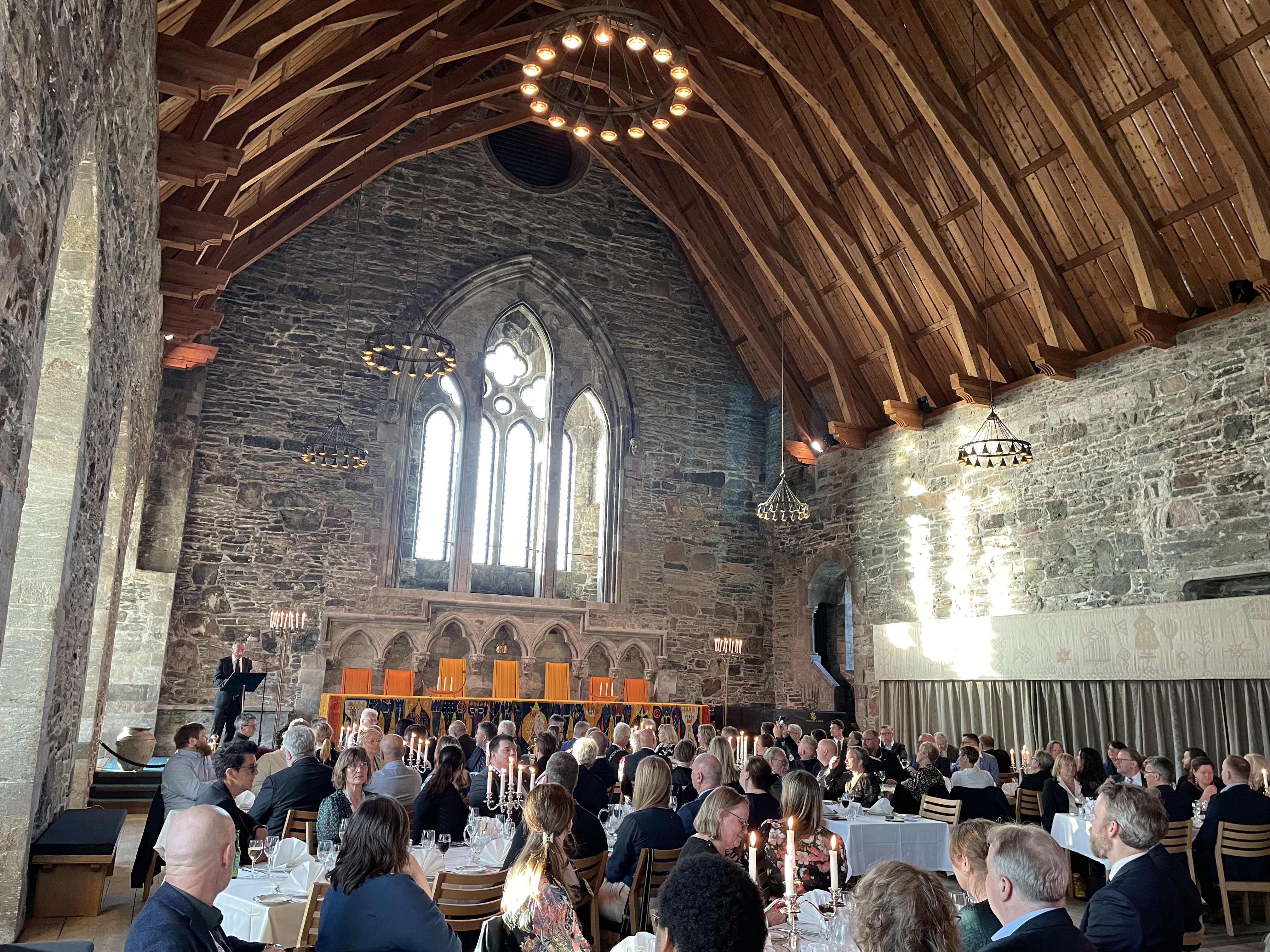 Representantskapet fikk gledelig besøk av statsminister Jonas Gahr Støre før kveldens høydepunkt: festmiddag i Håkonshallen. Vi retter en stor takk til våre kollegaer på regionkontoret LO Vestland som hadde ansvar for arrangementet sammen med LOs administrasjon. Middag i den flotte Håkonshallen var en super opplevelse, og den blei ekstra spesiell med forrykende underholdning av Fargespill.