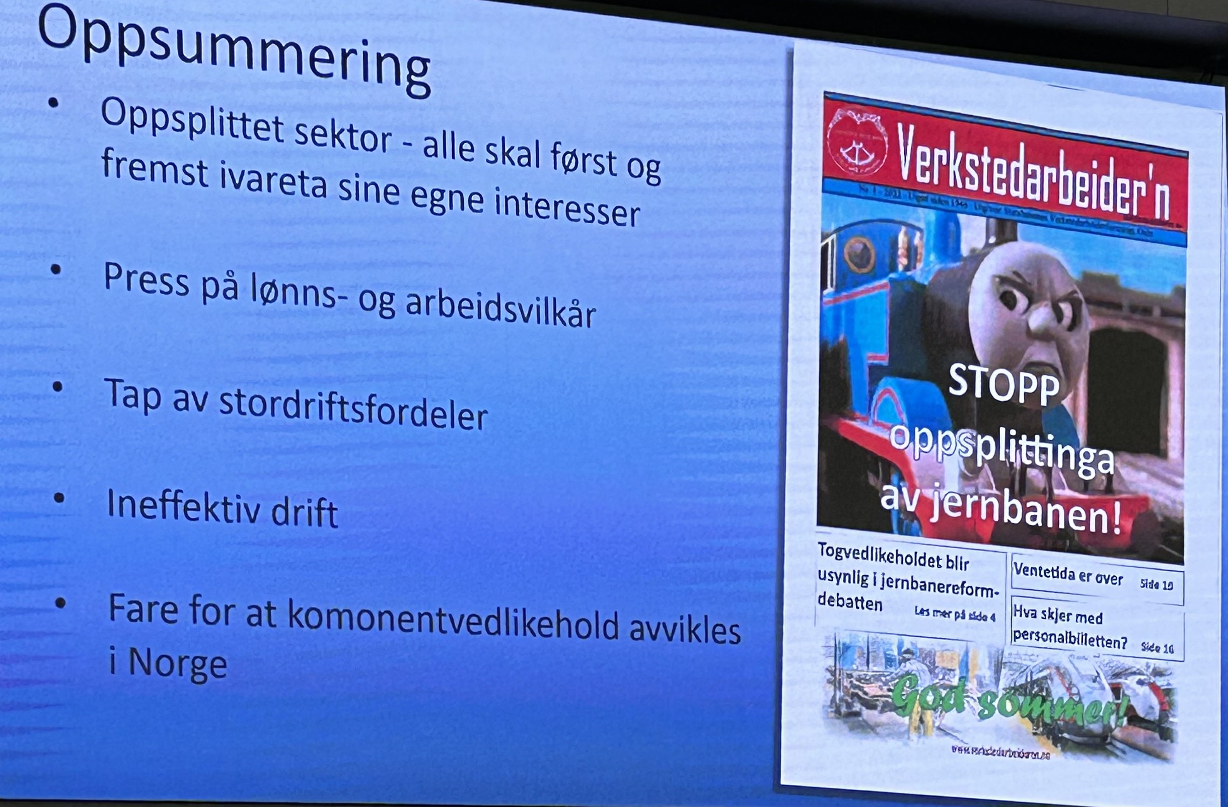 Det var forsåvidt støtte til en del av grepene som regjeringen har gjort med å stanse videre oppsplitting, og starte med å reversere en del av oppsplittingen av jernbanen. Men de fleste på konferansen mente det gikk for sent med forhandlingene om den fjerde jernbanepakken med EU.