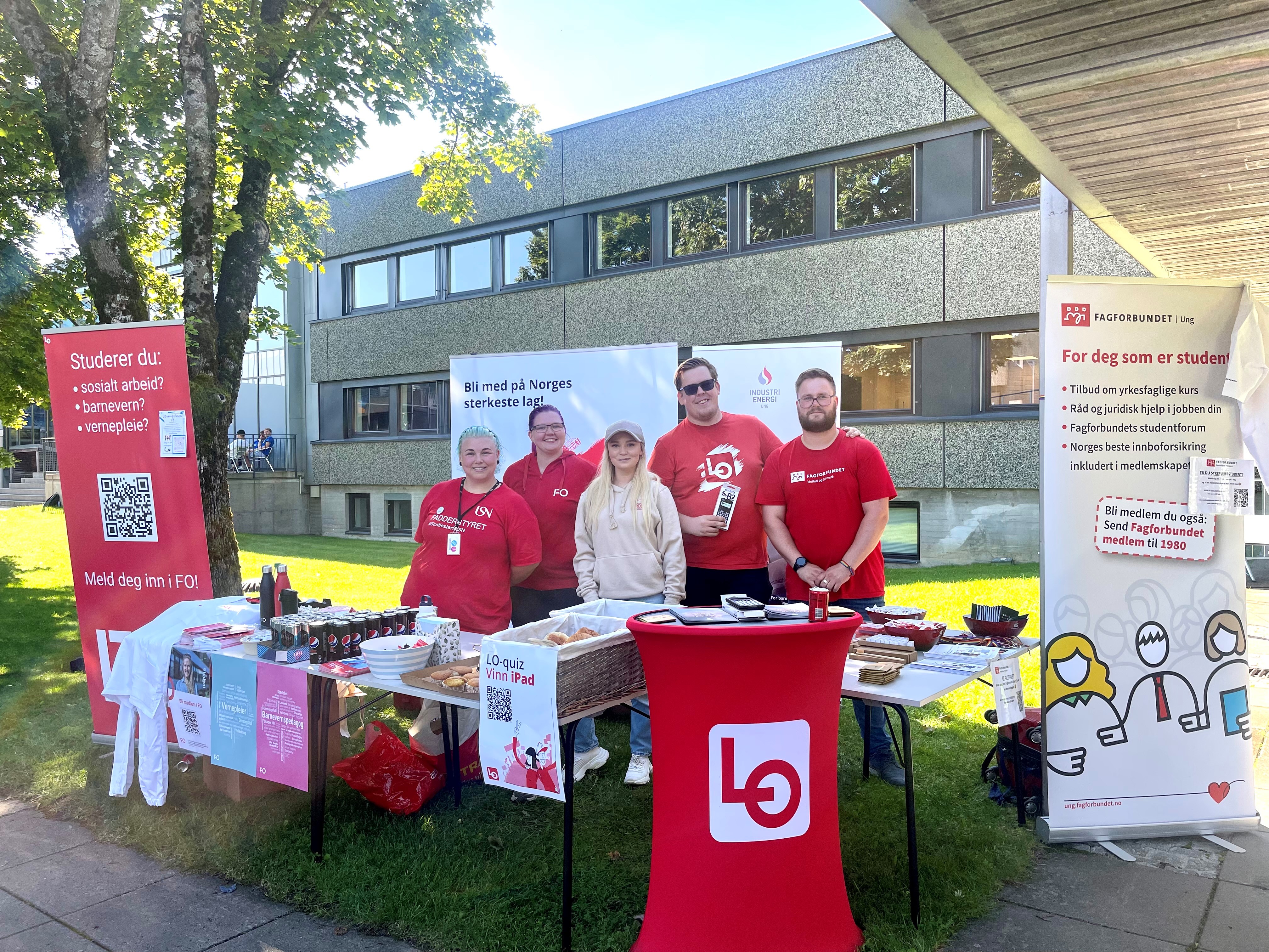 LO-studentene fikk sammen med Fellesorganisasjonen, IndustriEnergi og Fagforbundet, stå på stand under USNs fadderuke i Porsgrunn på torsdag.