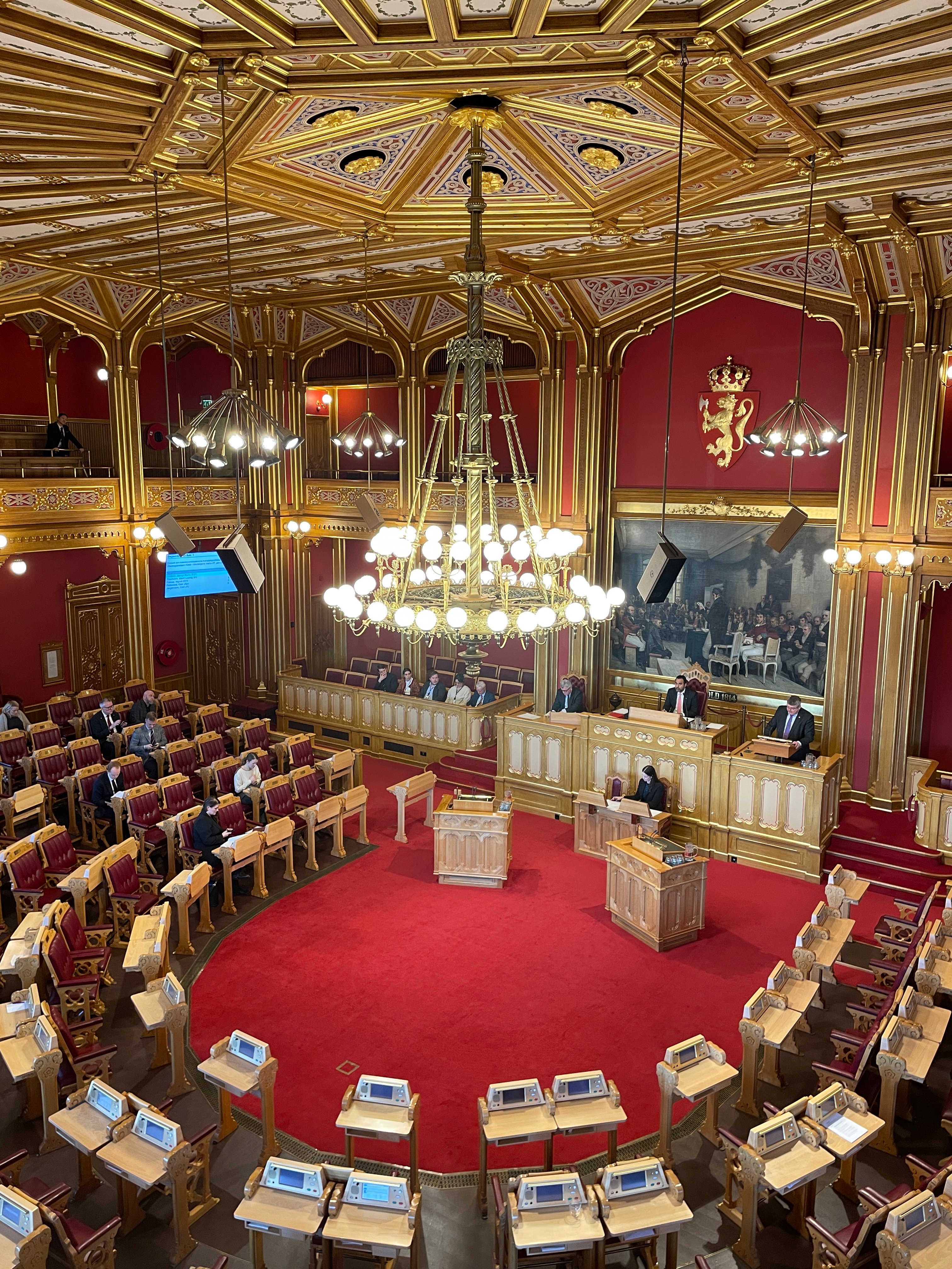 På Stortinget ble vi tatt imot av stortingsrepresentantene Konstanse Mari Alvær og Truls Vasvik. Vi fikk overvære litt av debatten om næringsministerens handelspolitiske redegjørelse i den ærverdige stortingssalen. Deretter fikk vi besøke Vandrehallen og Eidsvoldsgalleriet før vi samlet oss i kinosalen som benyttes av Arbeiderpartiets stortingsgruppe.