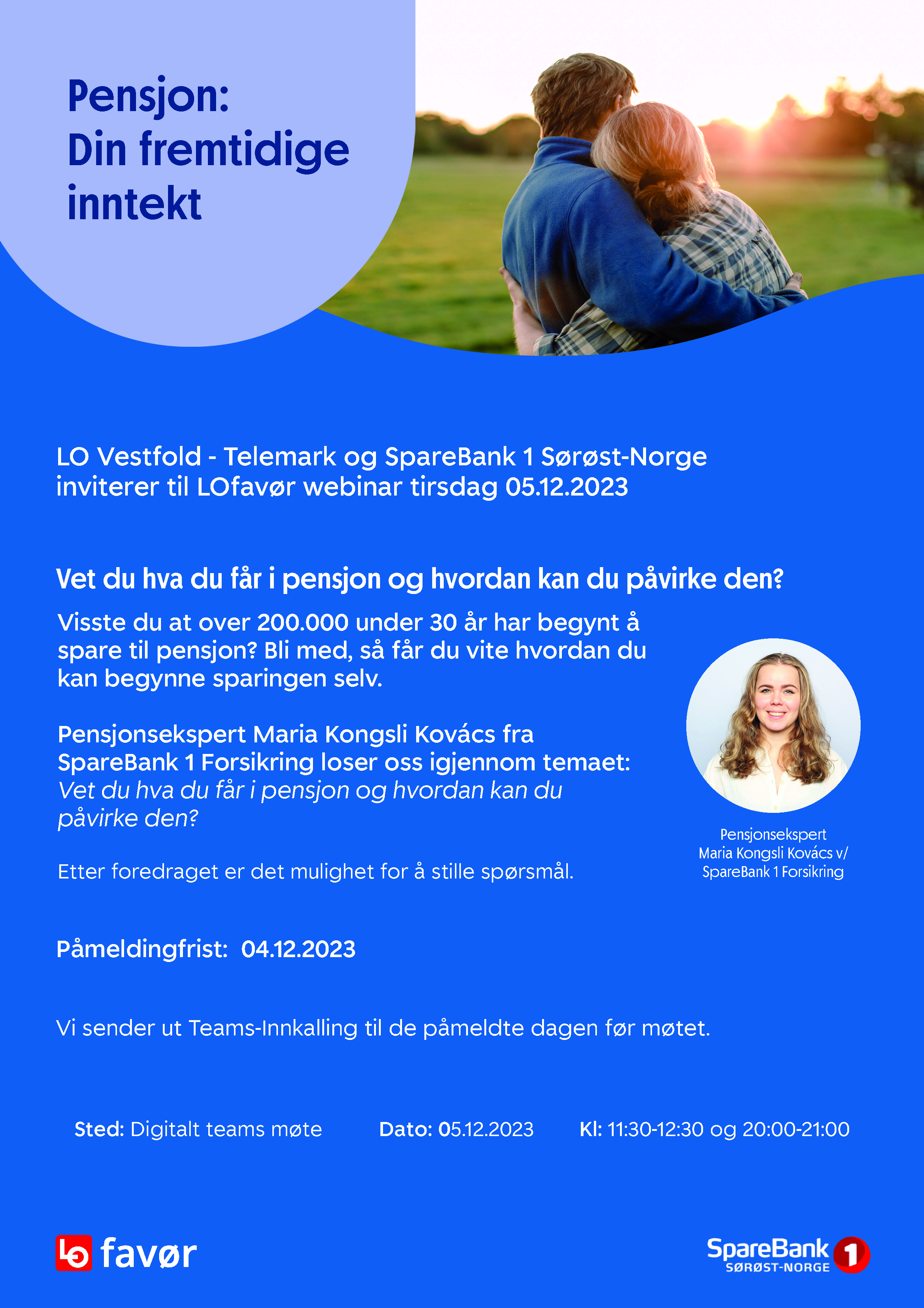 LOfavørkomiteen i Vestfold og Telemark og SpareBank1 Sørøst-Norge inviterer til webinar 5. desember med tema: Pensjon – din fremtidige inntekt. Vet du hva du får i pensjon og hvordan du kan påvirke den?